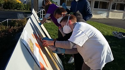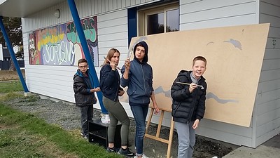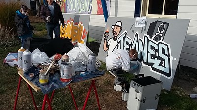 Les jeunes ont commencé par installer le matériel (bombes, planche, pinceaux, musique) et c’était parti ! Dans un premier temps ils ont terminé les contours et en second il fallait faire le remplissage. Kévin a terminé les finissions en deux trois minutes et le tag était terminé.
