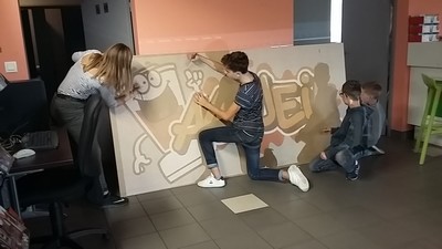 Ensuite il était temps de commencer à dessiner. Il leur a montrer deux techniques de graff, le block et le bubble pour réaliser les écritures. Les écritures trouvées, il a fallu réfléchir à ceux qu’ils allaient rajouter comme dessin à côté. Cela n’était pas simple mais ils ont réussi à se mettre d’accord. La prochaine étape était de réaliser le dessin sur les planches.
