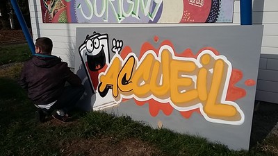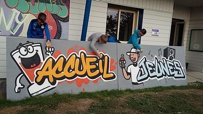 Durant les vacances de la Toussaint, Kevin Le Gall un graffeur Tourangeau est venu proposer une initiation. Kévin est intervenu le mercredi 26, le samedi 29 octobre et le mercredi 2 novembre. En tout, 5 jeunes ont réalisé le nouveau graff de l’accueil jeunes qui se situe devant l’accueil.