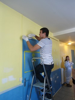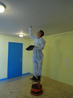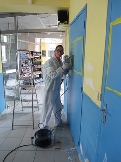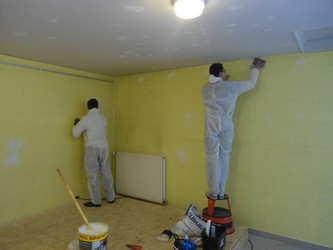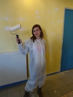 Après la fabrication de la scène que vous avez pu suivre dans les précédents articles, les jeunes se sont lancés dans la remise en état de la salle d’activités, qui en avait bien besoin… Trous dans les murs et dans le plafond, peinture qui s’écaille, pièce sombre… Au vu de ce constat, une douzaine de jeunes, dont plusieurs jeunes du voyage se sont mobilisés pour rendre la salle plus claire et plus propre. A chacun son pinceau donc, ou son rouleau, ou sa feuille de papier à poncer, ou sa truelle afin de réaliser les travaux nécessaires à l’embellissement de cette pièce qui accueille la scène ainsi que le billard. A cette occasion, certains ont pu utiliser leurs propres compétences et meme apprendre aux autres à réaliser un enduit, à poncer un mur, ou encore à peindre au rouleau. Deux sous-couches ont été nécessaires pour recouvrir l’ancienne peinture, maintenant il faut repeindre… mais vous en saurez plus dans notre prochain épisode.