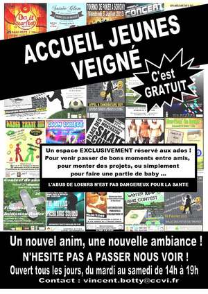 L’appel est donc lancé à tous les jeunes de Veigné et d’ailleurs ; Si tu as envie de passer de bons moments avec tes potes, si tu souhaites organiser et monter des projets la bonne adresse c’est l’accueil de Veigné !!!