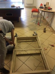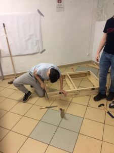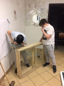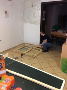 Après avoir récupéré une palette, ils se sont servis des lattes de celle-ci pour fermer ce qui sera la base de la maison. Ensuite, avec des tasseaux, ils ont fait les structures du toit. Pour que les jeunes enfants du RAMEP puissent ouvrir la maison à escargot et y déposer de la salade ou tout autre chose, les jeunes ont fixé le toit à l’aide de charnières.
