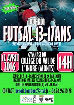 Le mardi 12 avril le service jeunesse de la CCVI et la junior association Move It de l’Accueil Jeunes de Saint-Branchs organisent la deuxième édition du tournoi de Futsal pour les jeunes de 13 à 17 ans au gymnase du collège du Val de l’Indre. Pour participer les jeunes doivent faire remplir leurs autorisations parentales disponibles dans tous les accueils jeunes, constituer une équipe de 5 joueurs + 1 remplaçant et payer une participation de 1€ par joueur. Sur place, ils trouveront une petite restauration et une buvette sans alcool. Attention les champions remettre leur titre en jeu dès 14h!