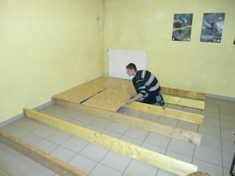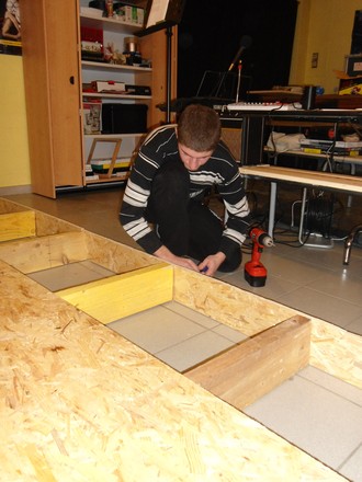 Ca bricole dur en ce moment, à l’Accueil Jeunes de Monts. Les jeunes sont actuellement en train de construire une scène de 2m70 sur 3m60 sur 17 cm de hauteur (eh oui, les plafonds sont bas !) pour pouvoir accueillir et voir se produire différents artistes ou groupes, amateurs ou confirmés au sein de l’Accueil Jeunes. Après de savants calculs, il a fallu s’attaquer à la découpe des bastaings et des planches de bois OSB qui constituent le plancher. Une fois que tout a été positionné correctement, il a fallu visser les planches dans les bastaings pour solidifier l’ensemble. Il est prévu d’agrémenter le tout avec quelques astuces mais je ne vous en dis pas plus, car tout n’est pas terminé. Nous vous donnerons bientôt des nouvelles de l’avancée des travaux…