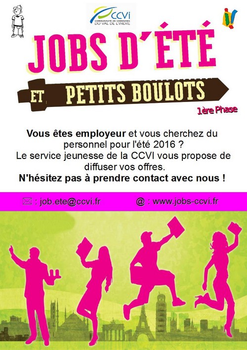 En effet, lors de la période estivale, de nombreux jeunes entre 16 et 18 ans recherchent un travail et se rendent ainsi dans les accueils jeunes du Val de l’Indre ou sur le site www.jobs-ccvi.fr. Parallèlement, certains employeurs ont des besoins en personnel durant cette période. C’est pourquoi le service jeunesse veut faciliter l’échange entre les deux parties. Cette année, l’objectif est d’enrichir les offres proposées aux jeunes et donc de recevoir toutes les offres des employeurs susceptibles de les recruter pour des postes saisonniers.