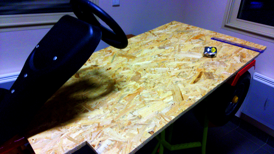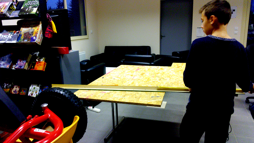 Pour l’instant les jeunes sont dans l’aspect mécanique et pratique de la caisse. Découper la planche qui servira de bas de caisse, réfléchir à la fixation du siège du futur pilote, réfléchir à l’accès au système de freinage.