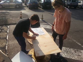 Afin que la communication de leur événement soit visible dans le commune, les jeunes ont créé des panneaux en bois. Par la suite, ils vont faire le tour des skate-parks de la CCVI ainsi que des villes aux alentours pour attirer un maximum de trottiriders !