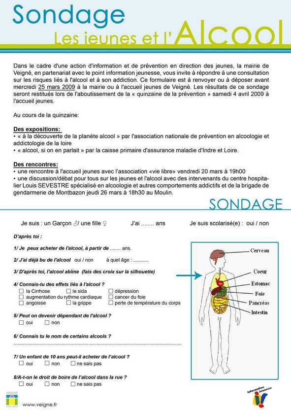 Cette action débutera par la diffusion d’un sondage à destination des CM2 jusqu’aux jeunes lycéens portant sur des questions de législation, altération du corps, mode de consommation…. ce questionnaire est à retirer et à rendre en Mairie, à l’Accueil Jeunes ou ici même