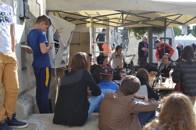 Pour cette occasion un dispositif spécial a été mis en place. En effet, outre la diffusion habituelle sur internet, la RAJ était retransmisse en direct sur la place de mairie. Les nombreux jeunes présents ont donc endossé le rôle très officiel de « speaker » de la manifestation. Accompagné par les animateurs jeunesse de la CCVI les « ados journalistes » ont assuré leur mission toute la journée. Interviews, promotion des animations, programmation musicale … la journée fut chargée et intense. Jugez plutôt ; 7 heures de direct durant lesquelles les jeunes et les animateurs ont accueillis au micro pas moins de 20 invités. Pour la dernière émission de la journée, Dorian, un jeune Vindinnien a participé non sans une pointe de stress à une double interview : Mr Michaud, maire de sa commune et Cédric Olivier, responsable de la police municipale et organisateur de la journée.
