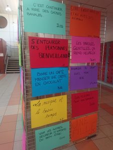 Le but : recueillir les pensées et commentaires sur une thématique précise : » Que fais-tu pour ton bien être et te sentir heureux ? », afin de réaliser une exposition.