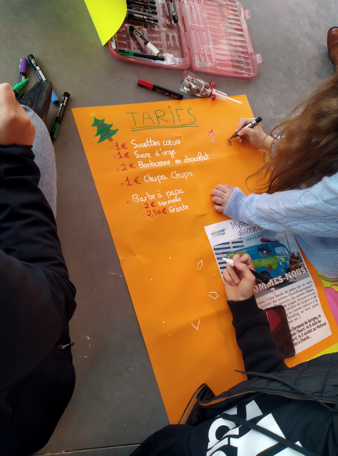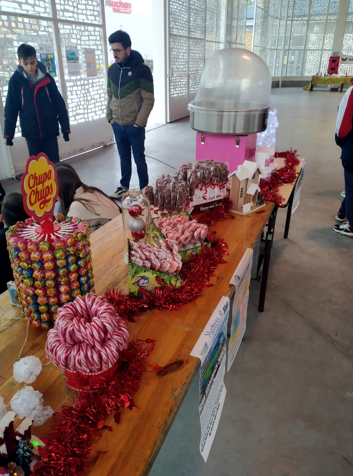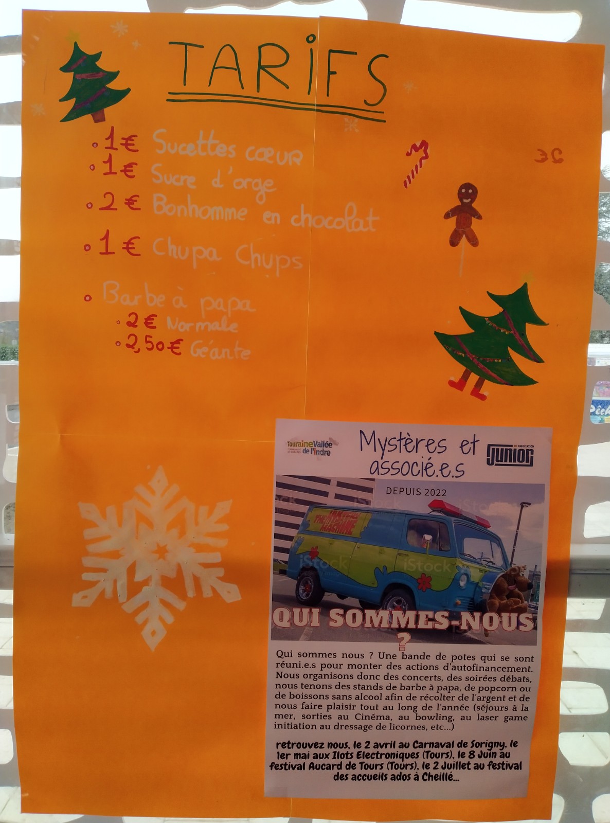 Ce fut le 26 Novembre dernier. Installé dans la toute nouvelle Halle de Sorigny, le stand tenu par les jeunes, et notamment de la Junior association « Mystères et associé.e.s » basée à l’accueil ados de Veigné, proposait toutes sortes de choses dans l’esprit de Noël : Des sucettes en forme de coeur, des sucres d’orge, des barbes à papa aux parfums pas communs (chewing gum, Cola…), et des Bonhommes en guimauve et chocolat.