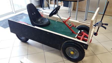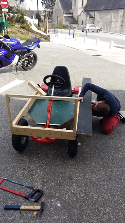 Les vacances de Pâques ont été rythmée par la construction d’une caisse à savon par les jeunes. Après avoir reçu une base de kart à pédales (sans le pédalier et avec une planche en guise de base de construction), les jeunes de Truyes sont partis sur la construction d’une caisse à savon selon leurs envies.
