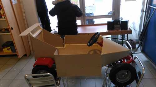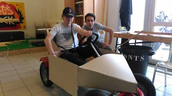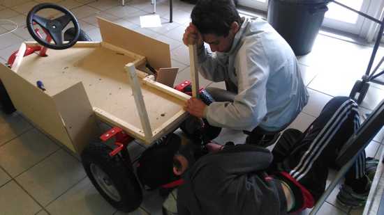 Et c’est parti pour onze semaines jusqu’aux prochaines vacances scolaires ! Heureusement les dernières ont été à la hauteur. Les ados avaient bien débuté la première semaine par la construction de leur caisse à savon envue de la course du 28 mai sur leurs terres. En trois sessions de bricolage et un bel engouement collectif, ils ont trouvé leur thème, certes peu original comme en atteste la photo ci-dessous, et bien carburé sur la construction. Il leur reste à affiner quelques découpes, à trouver un beau siège et lui donner les couleurs d’une Ferrari. L’équipage Fayçal/Pierre/Lucas a tout misé sur la tenue de route et la parfaite connaissance du parcours quand d’autres équipages des accueils jeunes alentours ont préféré joué la carte du poids. Les locaux savent bien que sans maîtrise la puissance n’est rien. Simplicité et sobriété sont leurs maîtres-mots.