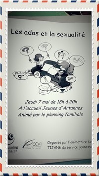 Pour la deuxième action, le Planning Familial viendra à l’accueil jeunes le jeudi 7 mai de 18h00 à 20h00. pour une intervention sur la sexualité. Une exposition sera présentée afin d’attiser la curiosité des jeunes. Cette action se déroulera en 3 temps. D’abord, il est nécessaire de fournir au public quelques explications sur ce qu’est Planning Familial et à qui il s’adresse. Le deuxième temps sera réservé aux questions sur l’exposition. Une boite sera placée juste à côté pour garantir l’anonymat. Enfin, l’intervenante du Planning Familial animera un débat pour conclure la soirée.