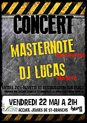 En effet, le 22 mai à partir de 21h et pour 2€ seulement, vous pourrez assister au concert de Masternote, un groupe de collégiens d’Alcuin dans un registre Metal/Rock et Dj Lucas, un autre collégien qui avait enflammé la salle des fêtes de Saint-Branchs lors de la soirée Fluo du mois de Février. Sur la place, vous pourrez retrouver une buvette sans alcool et un coin restauration.