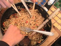 Au menu: guacamole, salade gourmande, camembert frit, ficelles picardes, pâtes chinoises au satay et leurs petits légumes, noix de pétoncle et leur fondue de poireaux, Nutella maison, compote aux 3 pommes et brioche perdue.
