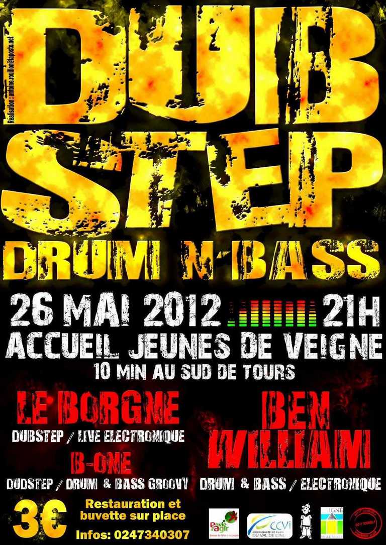 - B-ONE: dans un set dubstep/Drum&bass groovy et puissant - LE BORGNE: pour un gros live Dubstep/Electronique ( www.myspace.com/?artemusleborgne) - et BEN WILLIAM: pour cloturer la soirée dans un très très gros set Drum & Bass ( www.myspace.com/bendjben)