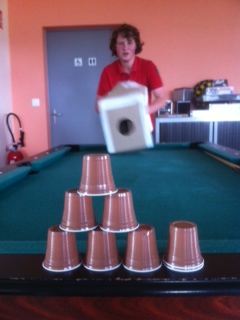 Le principe est simple : faire tomber les tours de gobelets adverses sans se faire toucher par les vortex… mais c’est quoi un vortex ? Un vortex c’est… un courant d’air ! On crée ce courant en chassant l’air d’un canon qui peut prendre la forme d’un carton, d’un tube… Le truc qui est génial c’est qu’on peut visualiser le vortex avec de la fumée…