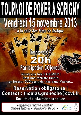 La Junior Association les « Junior’s Boys » organisent un tournoi de poker Texas Hold’em le vendredi 15 novembre à 20h à la salle des fêtes de Sorigny. De nombreux lots à gagner dont un lecteur DVD portable et une tablette tactile ! 5 € l’entrée, avec buvette et restauration sur place. Alors on prend son agenda et on note la date et l’heure ! Pour s’inscrire, vous pouvez renvoyer un message sur la page facebook de l’accueil jeunes de Sorigny ou à thomas.greneche@ccvi.fr