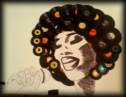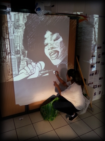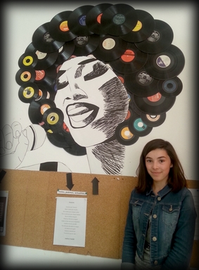 Depuis plusieurs mois, à base d’une heure par mercredi, Camille s’est lancée dans la création d’une fresque. Et pas avec n’importe quel matériel pour la coiffure : des vinyles ! Pour faciliter le dessin, le visage a été projeté sur une affiche d’abribus retournée. Ensuite, pour pouvoir bien faire le contour du crâne, les vinyles ont été chauffés au four puis découpés avant qu’ils ne refroidissent. Le puzzle pouvait alors commencé ! En voici le résultat.